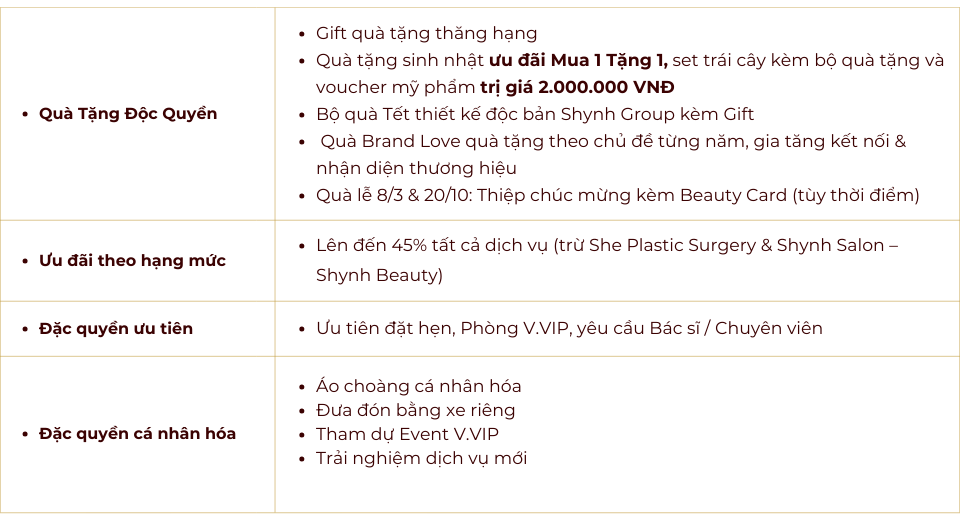 Tại Shynh House, chúng tôi tin rằng mỗi khách hàng đều xứng đáng nhận sự chăm sóc tốt nhất. Đó là lý do Shynh Elite Club ra đời – chương trình thẻ thành viên cao cấp dành riêng cho những tín đồ làm đẹp, mang đến đặc quyền tinh hoa và dịch vụ chuẩn quốc tế trong không gian clinic sang trọng.